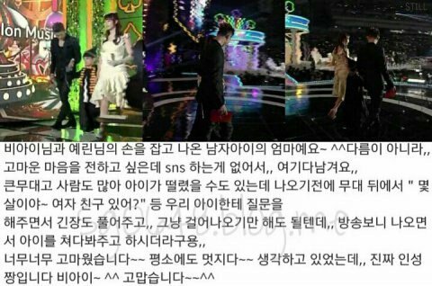 Con trai tôi rất lo lắng vì nó đang chuẩn bị bước lên một sân khấu lớn với sự theo dõi của rất nhiều người nên trước khi lên sân khấu, B.I hỏi thằng bé "Em bao nhiêu tuổi rồi ~ Có bạn gái chưa?" để giúp nó giảm bớt căng thẳng. Tôi có thể cứ thế mà bước ra nhưng khi thấy sân khấu đó, B.I cứ nhìn con trai tôi mãi.. Tôi vô cùng cảm ơn vì điều đó~~